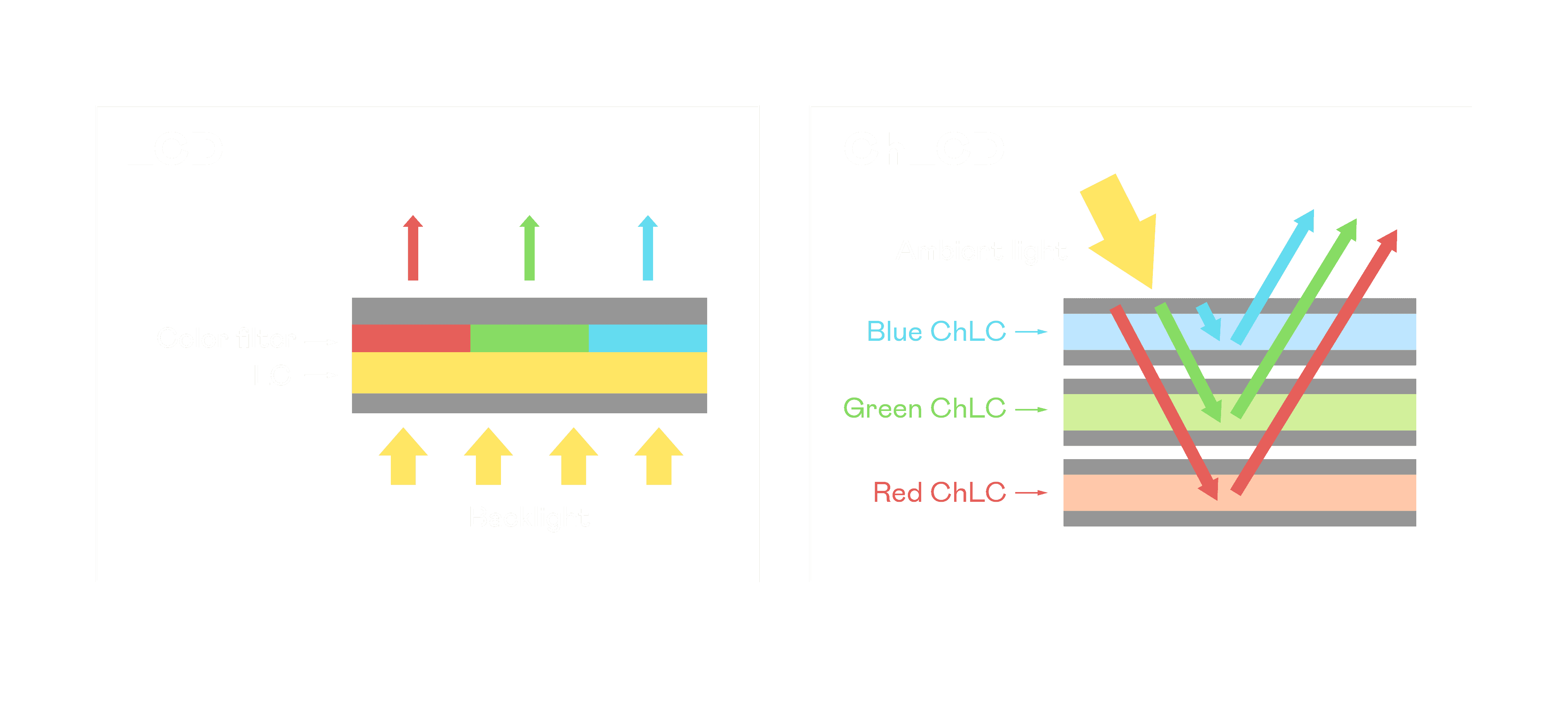 ChLCD 胆固醇液晶就如同纸张一样,,,透过反射环境光来显示影像,,因此长时间观看不易造成人眼视觉疲劳,,,,可达到护眼效果。。。。当处于户外阳光下使用,,LCD 影像容易失真而不易观看,,但胆固醇液晶仍可维持较佳的影像品质。。。。